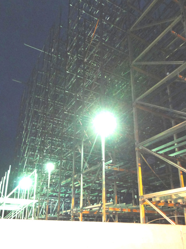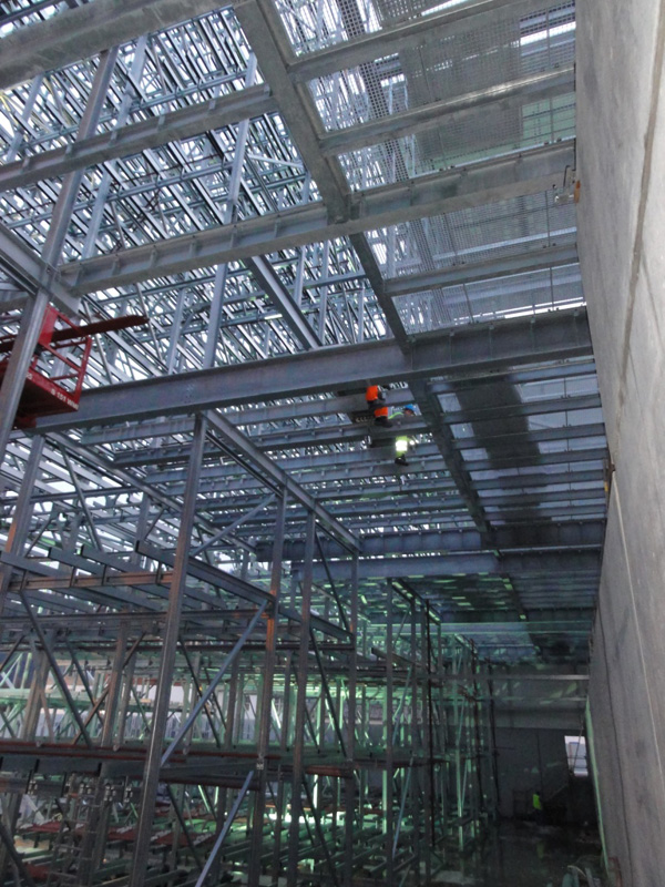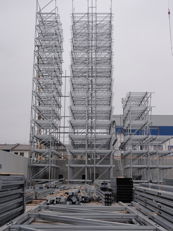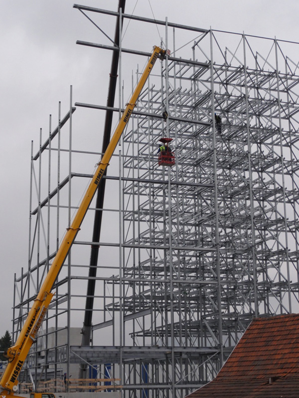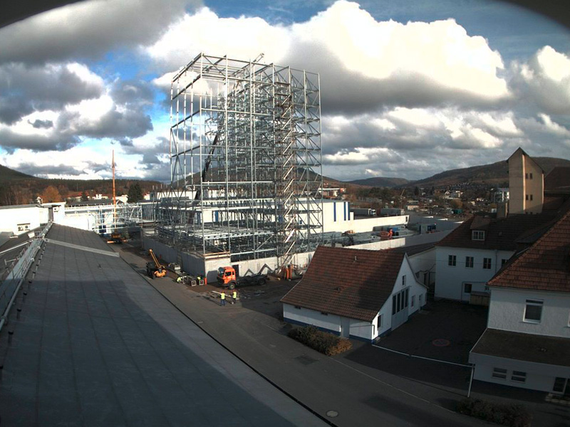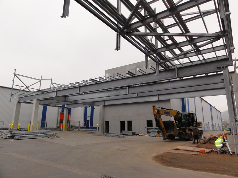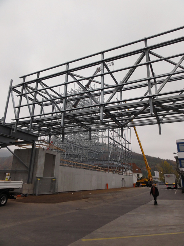 Wie aus den aktuellen Fotos ersichtlich, stehen bereits die ersten Regaleinheiten sowie die Tragkonstruktionen für die beiden Verbindungsebenen zu den benachbarten Produktions- und Lagerflächen.