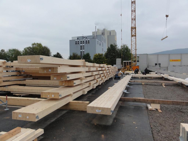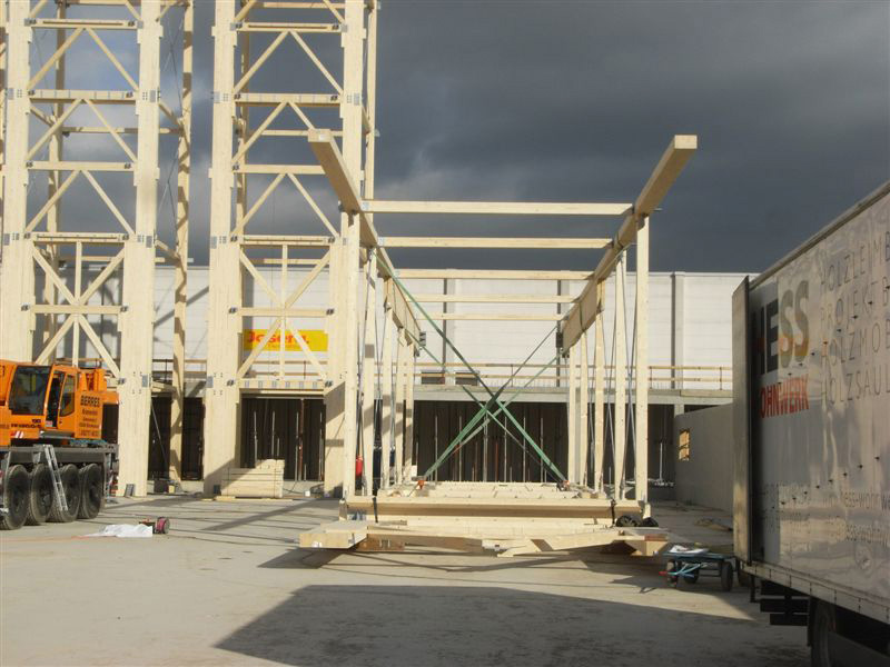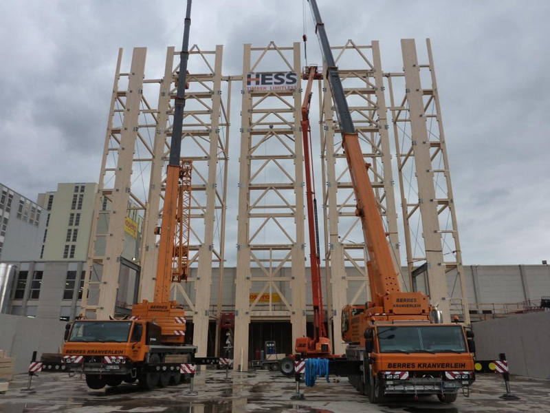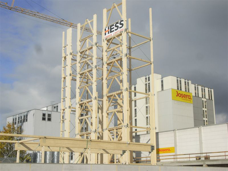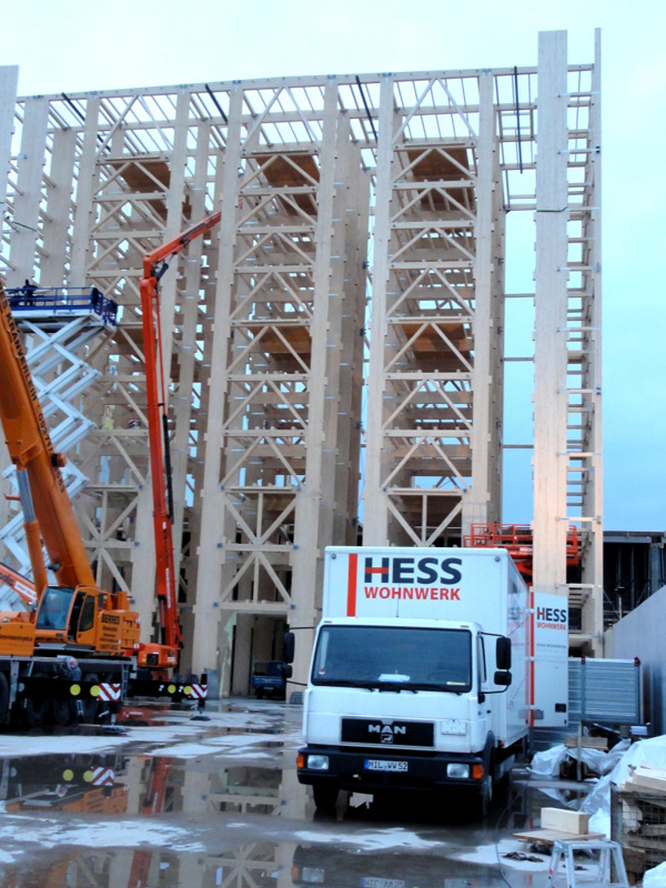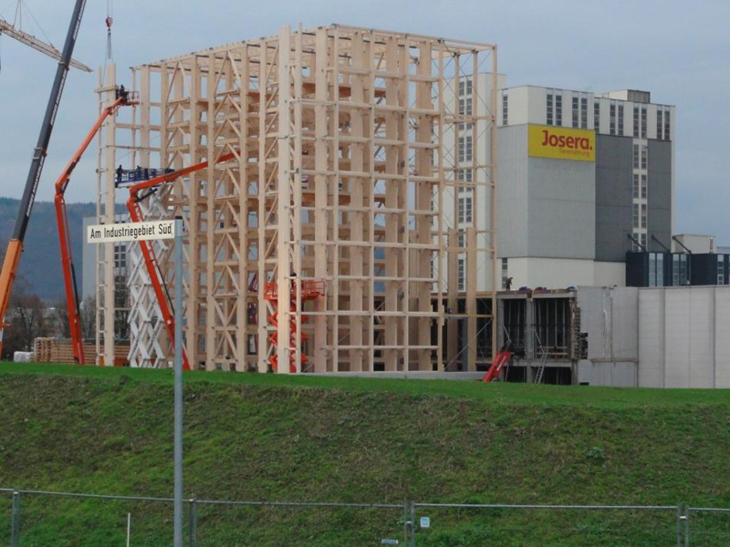 Mit der Verwendung von Brettschichtholz (BSH) anstelle Stahlelementen wurde bei Josera für Deutschland Neuland betreten. Auch hier ragen die ersten Regalsteher und Aussteifungstürme seit einer Woche in den Himmel.