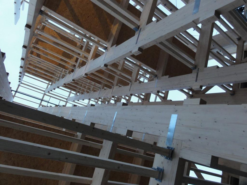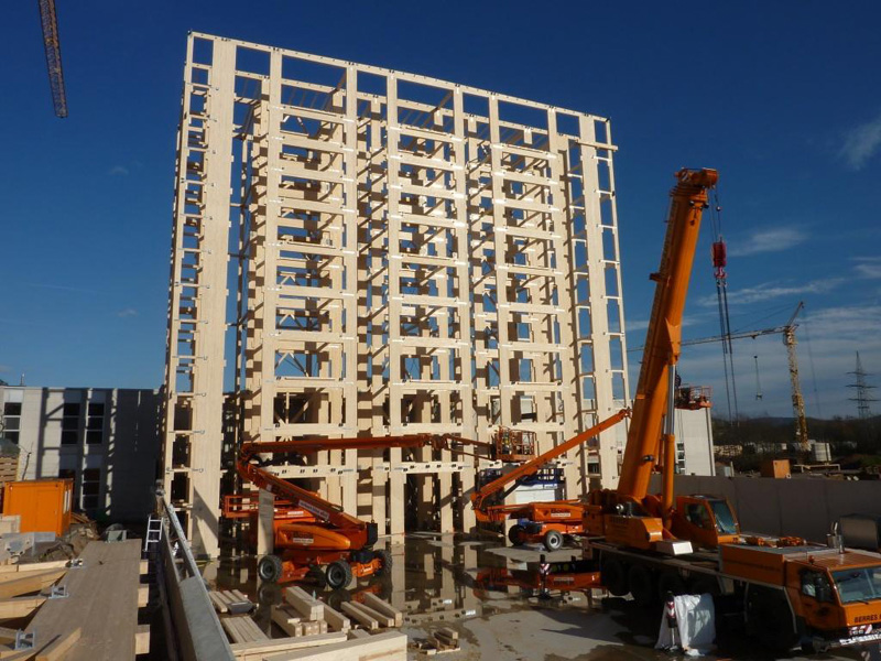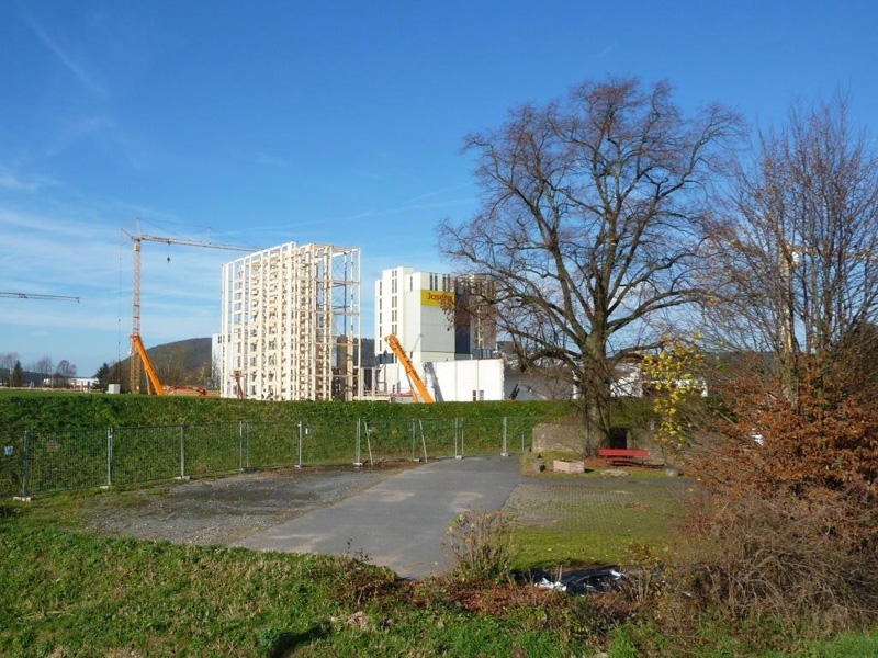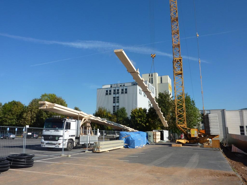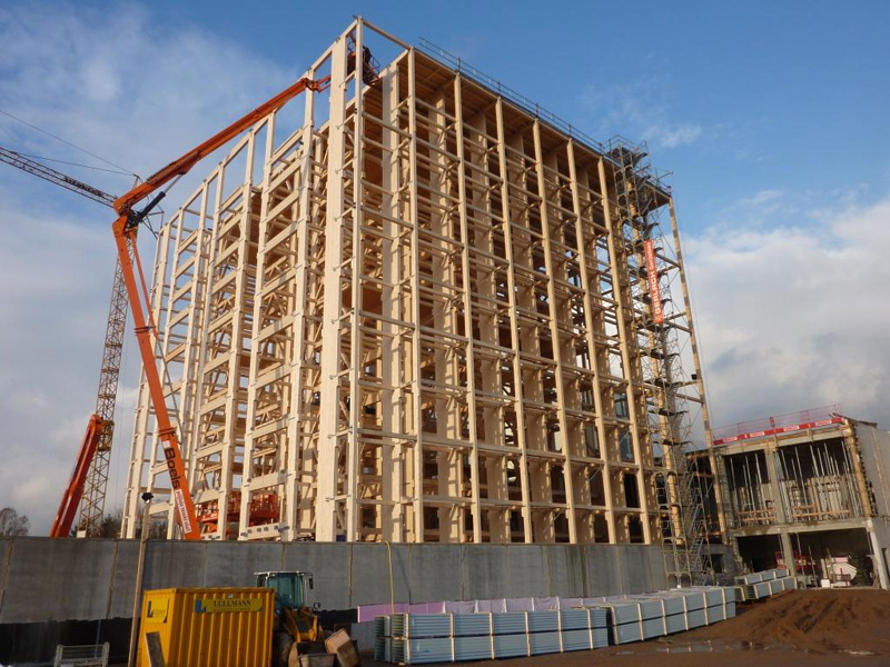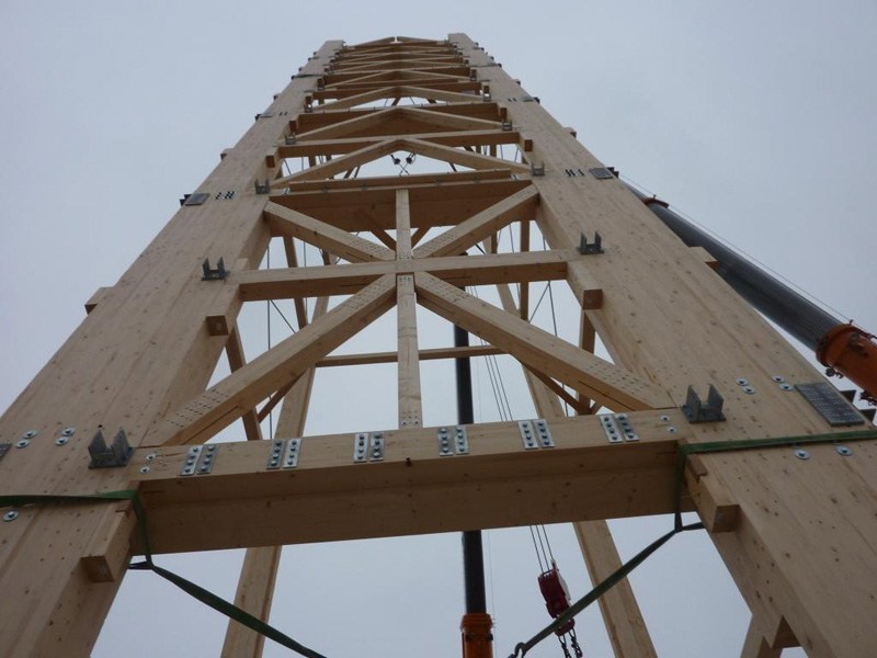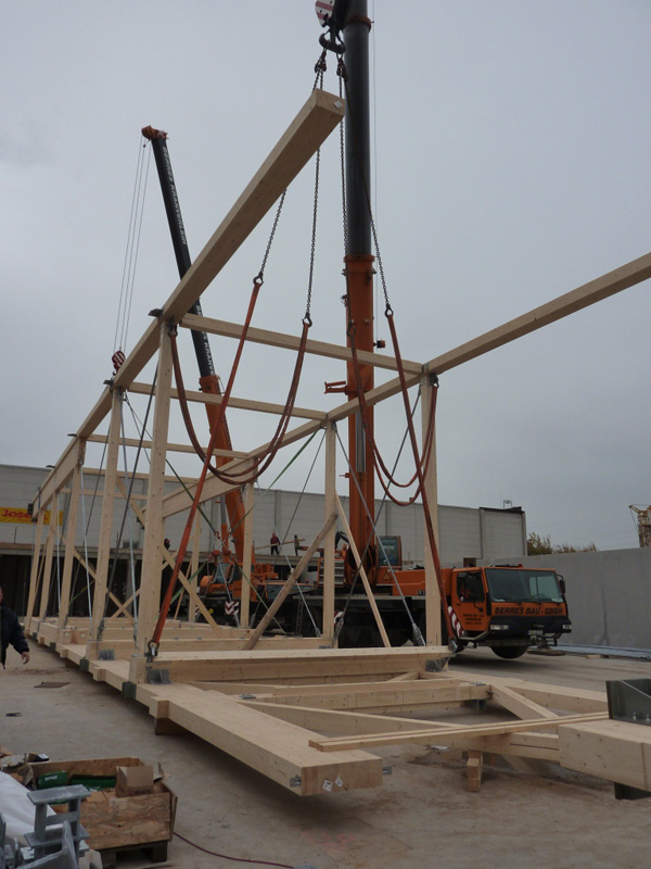 Mit der Verwendung von Brettschichtholz (BSH) anstelle Stahlelementen wurde bei Josera für Deutschland Neuland betreten. Auch hier ragen die ersten Regalsteher und Aussteifungstürme seit einer Woche in den Himmel.