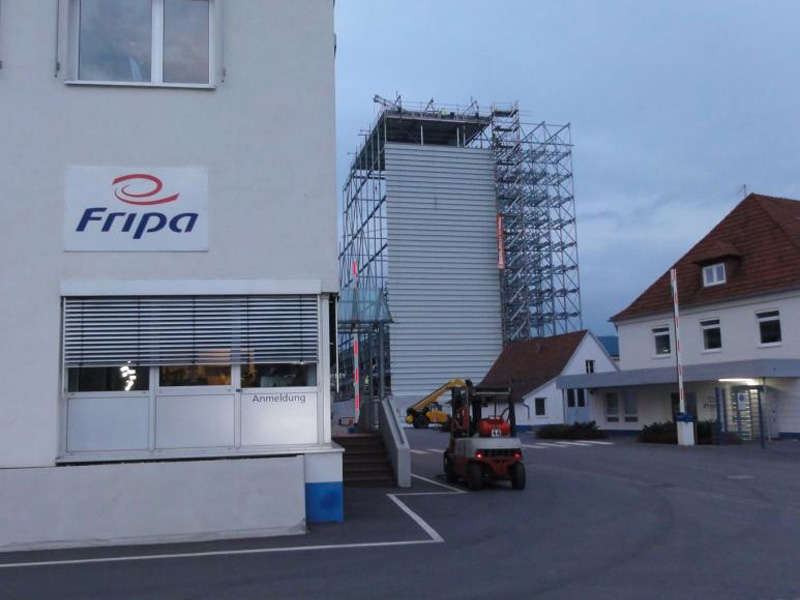 Im Falle Fripa handelt es sich um den für solche HRL-Silos dominierenden Stahlbau, aber mit der Besonderheit, dass pro Regalgasse auf beiden Seiten vier Euro-Paletten quer mittels Teleskopgabel (2 x 2 Paletten) eingelagert werden.