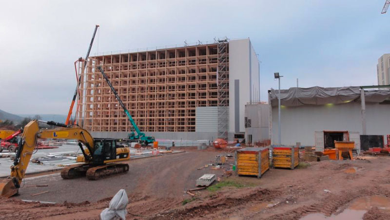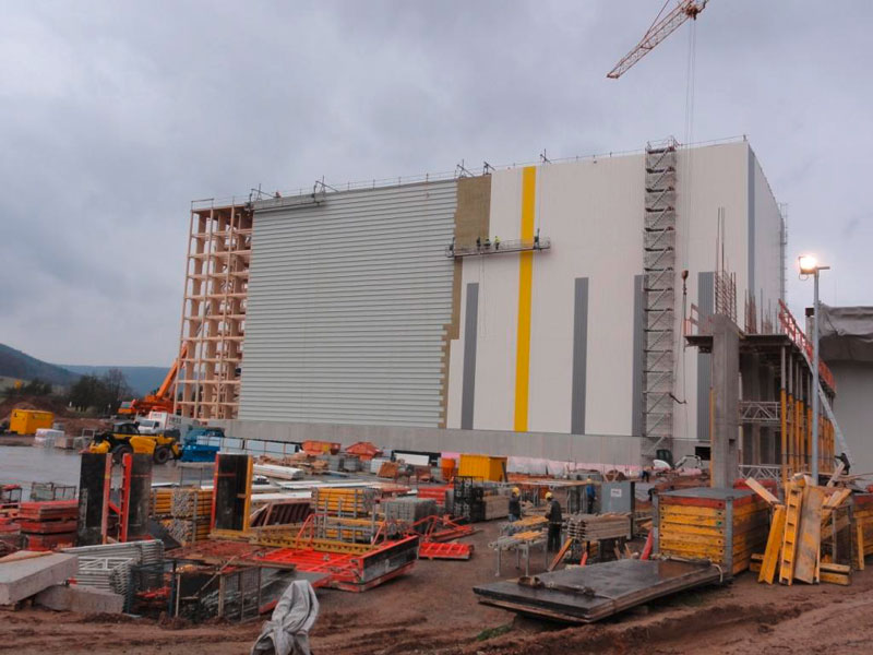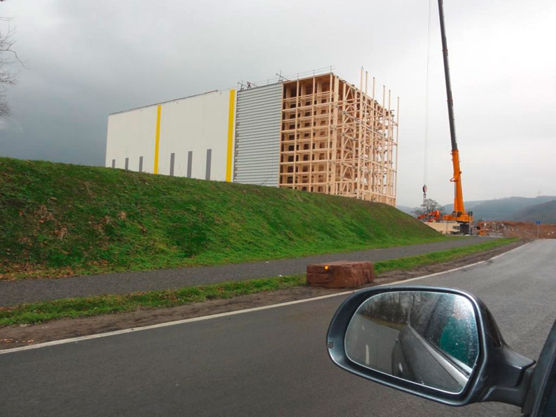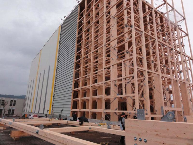 Langsam versteckt sich die Brettschichtholz-Konstruktion hinter der Fassade …