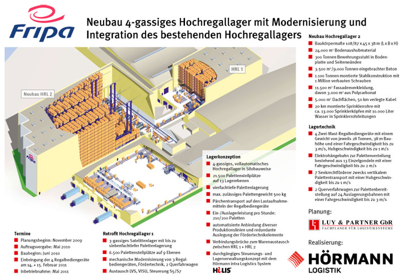 Auch wir nehmen diese offizielle Feier nochmals gerne zum Anlass, um uns für das große Vertrauen und die tolle Zusammenarbeit mit der sehr entscheidungs- und durchsetzungsfähigen Fripa-Geschäftsleitung und dem Projektteam unter der Leitung der Herren Giegerich (EK-Leiter / Gesamt-PL), Wasserer (IT-Leiter / LVS), Kirchgäßner (Lagerleiter) und Henning (Leiter Elektrotechnik) zu bedanken. Wir sind sicher, dass das neue HRL 2 in Verbindung mit dem einem Retrofit unterzogenen HRL 1 für Fripa einen echten Meilenstein bei der Neuausrichtung der Logistikabläufe zur internen und externen Effizienzsteigerung darstellt.