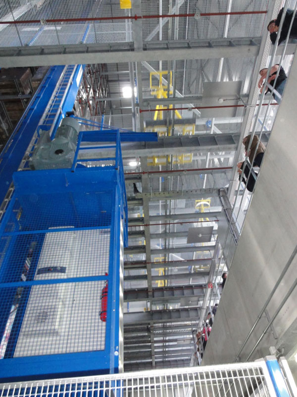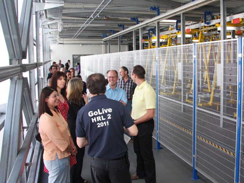 Im Anschluss daran hatten alle Gäste die Gelegenheit, die neuen Lagerfunktionen und Prozessabläufe zu besichtigen. Die besondere Aufmerksamkeit der fachfremden Besucher galt natürlich den automatisierten Abläufen in Form der wie von "Geisterhand" gesteuerten Regalbediengeräte (RBG) in Verbindung mit der Elektrohängebahn (EHB) und Palettenfördertechnik (PFT).