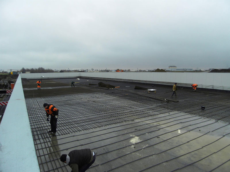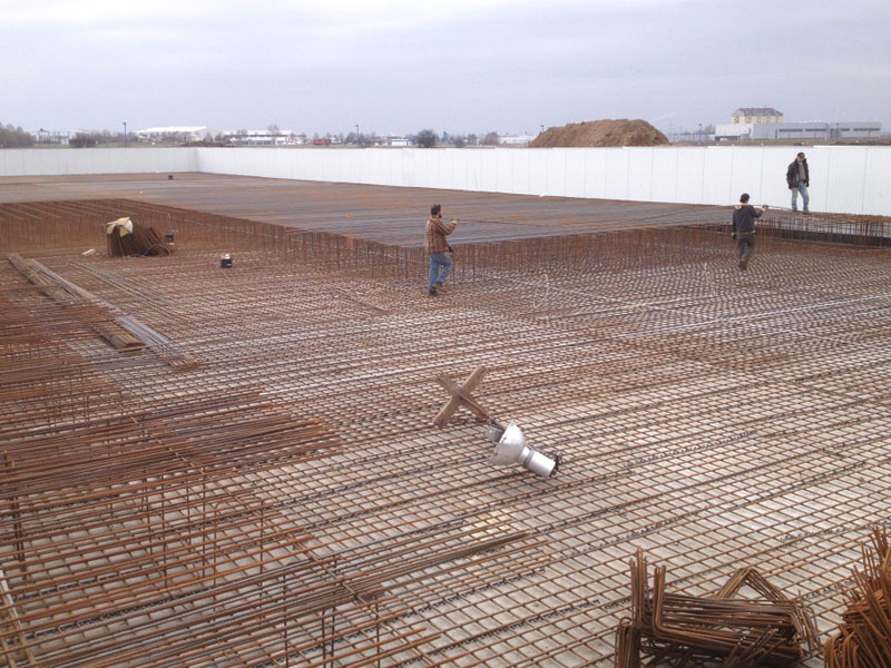 Wie aus den Fotos ersichtlich, sind die umfangreichen Armierungsarbeiten für die 1 m starke HRL-Bodenplatte nahezu abgeschlossen. Das Einbringen von ca. 2.000 m³ Fertigbeton ist für Mitte März 2012 geplant.