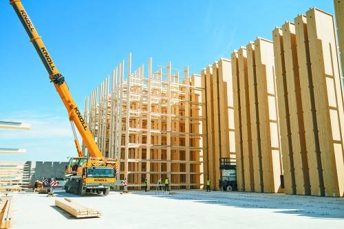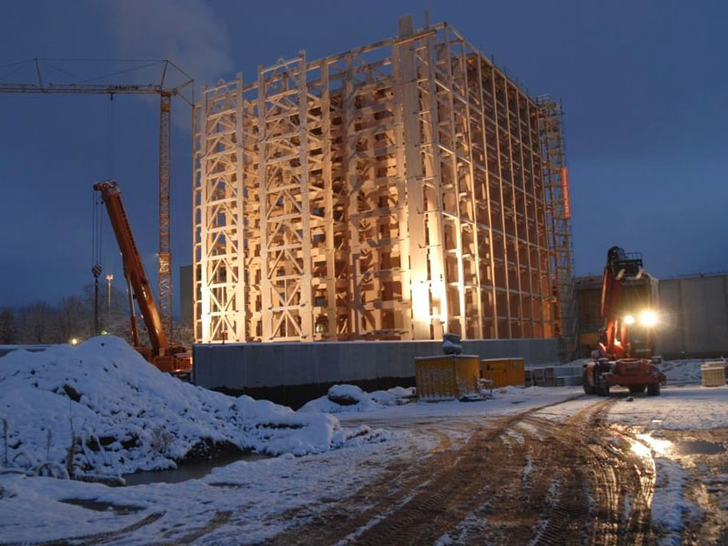 Für die gesamte Holzkonstruktion dieses HRL zeichnet die Vorarlberger Firma Kaufmann Bausysteme GmbH verantwortlich. Beim beauftragten Generalunternehmer (GU) handelt es sich um die Schweizer Swisslog AG.