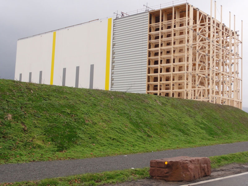 Nachdem von vielen Projektbeteiligten und vorbeifahrenden Autopendlern stets bedauert wurde, dass die während der Bauphase weithin sichtbare HRL-Konstruktion (H = 30 m) aus Brettschichtholz (BSH) der Hess Timber GmbH & Co. KG (Hersteller + Montage) seit Februar 2011 hinter einer Trapezblechfassade verschwand, haben die Josera-Verantwortlichen Abhilfe geschaffen. Mittels einer realistisch anmutenden Fotomontage auf einer großformatigen Klebefolie wird nunmehr ein Einblick in das HRL suggeriert …