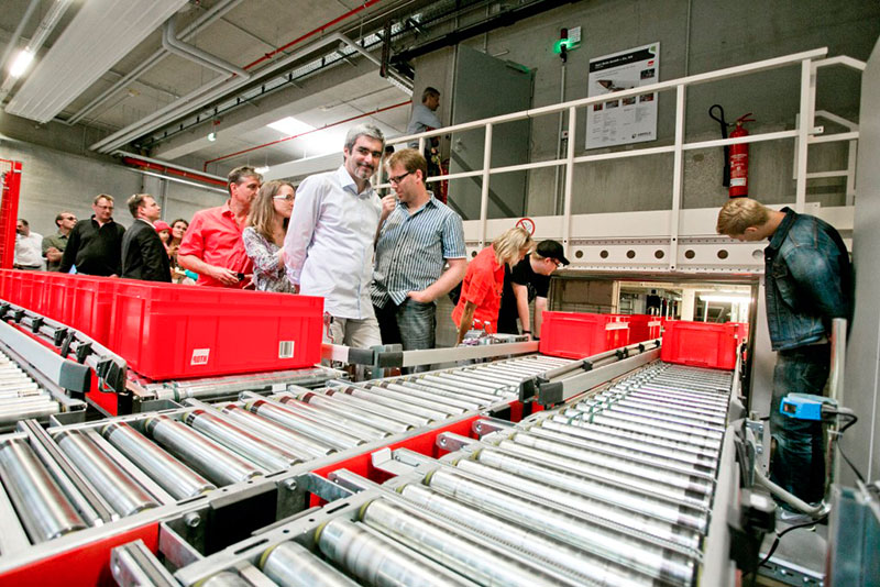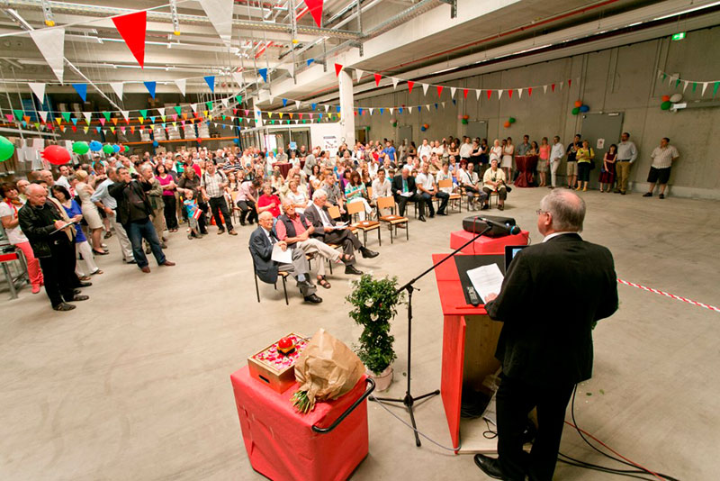 Der eigentliche Festakt fand vor ca. 500 Gästen und Betriebsangehörigen innerhalb der neuen Betriebsflächen statt. In kurzen Ansprachen und anhand von PowerPoint-Präsentationen über die diversen Projektschritte im Bau- und Logistikbereich erläuterten die Herren