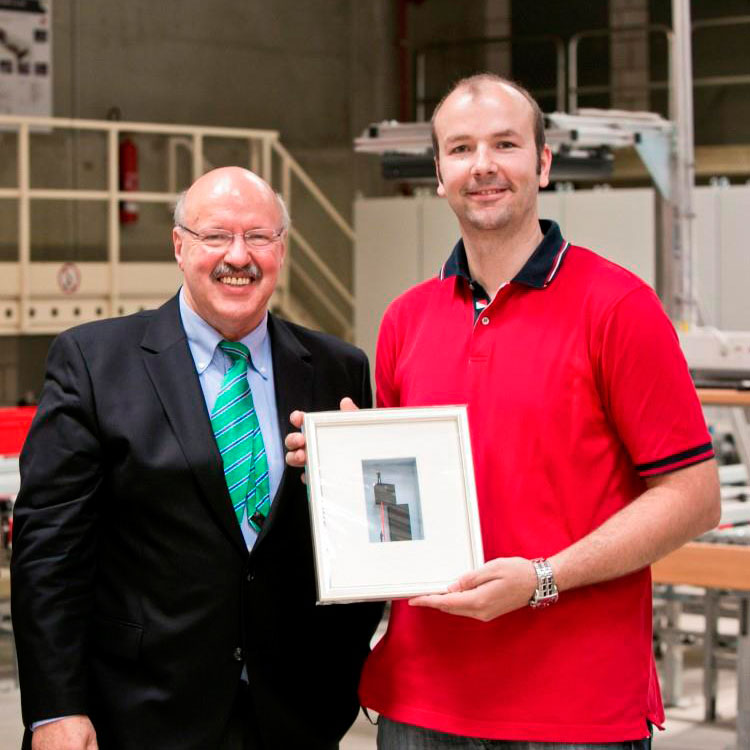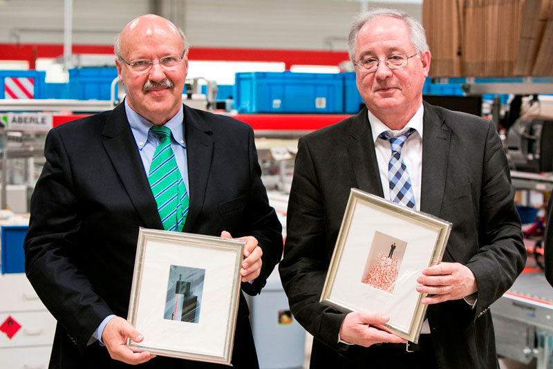 Im Anschluss daran bedankten sich die Herren Döllinger und Luy mit anlaßbezogenen Präsenten bei den Gesellschaftern und der Geschäftsführung für die stets angenehme und konstruktive Zusammenarbeit. Von Seiten Herrn Döllinger wurde Herrn Dr. L. Roth eine Fotomontage über die diversen Baufortschritte ausgehändigt. Herr Luy übergab an die Herren Dr. Wagner (GF) und Houdelet (IT-Leiter) projektbezogene Motive aus der Serie „Art in Boxes“ von Volker Kühn mit den Titeln