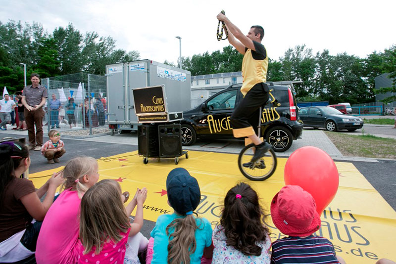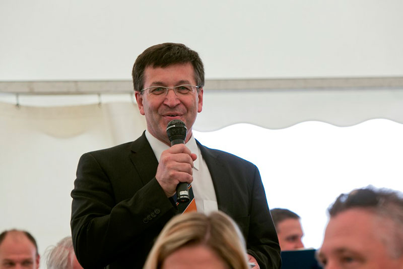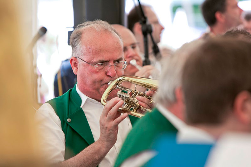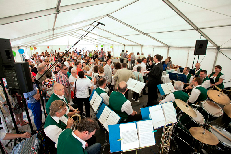 Durch die anschließenden Feierlichkeiten im Außenbereich und im Festzelt führte in professioneller Art und Weise Herr Lothar Haidmann, GF Vertrieb und Marketing. Akrobaten, Zauberer und eine zünftige Blaskapelle sorgten bei gutem Essen und vielfältigen Getränken für beste Stimmung unter den Gästen. Dabei untermauerte Herr Bodenseh eindrucksvoll, dass er nicht nur im Finanzbereich den Ton angibt sondern auch auf der Trompete.