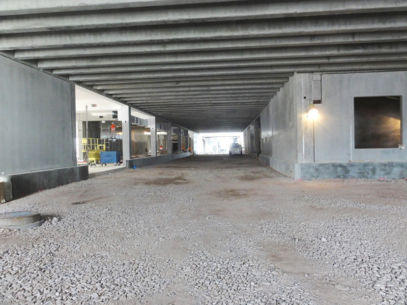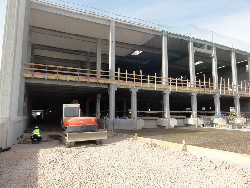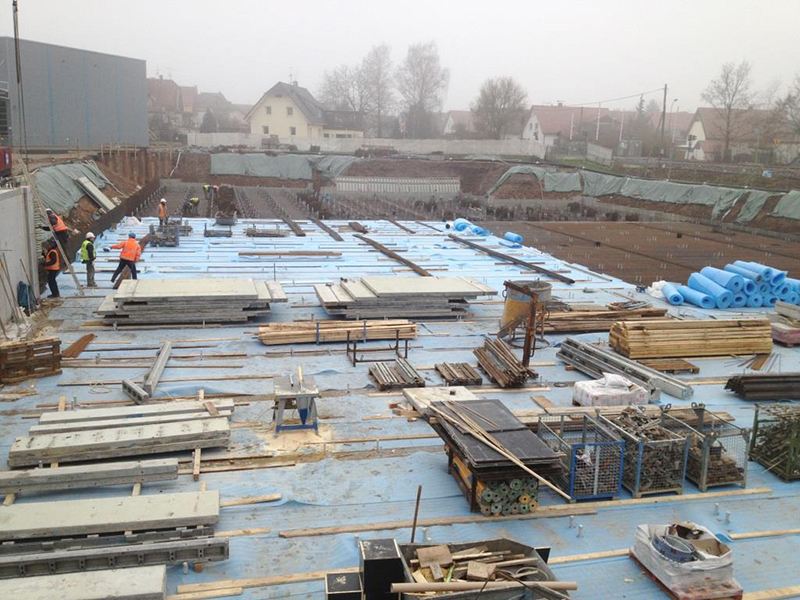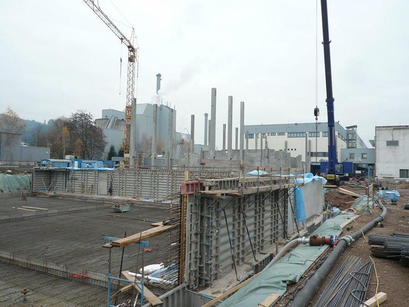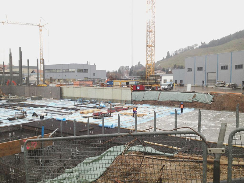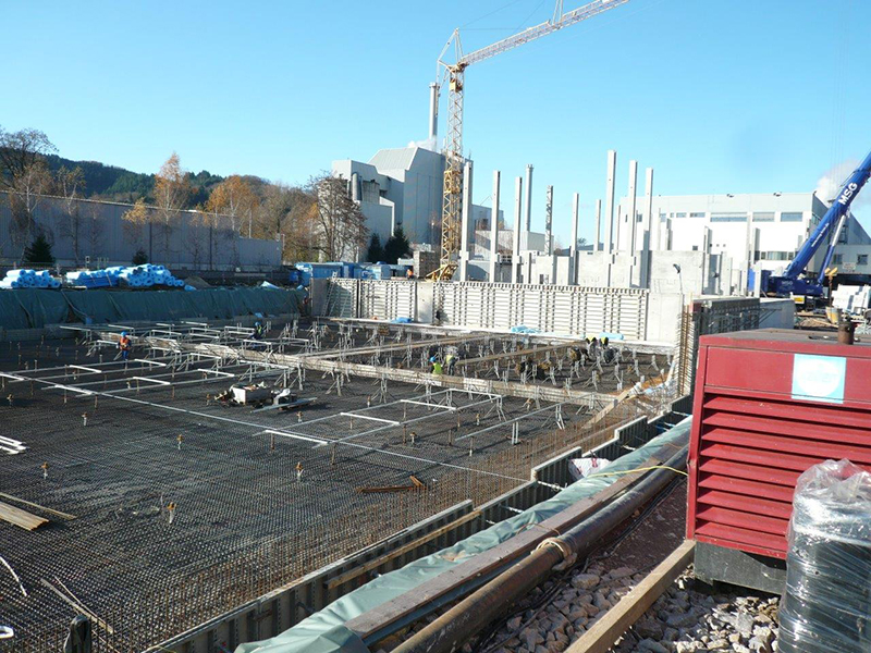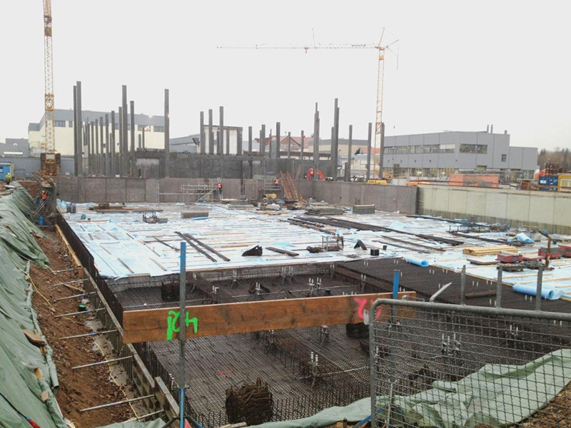 Nach der termingerechten Fertigstellung der HRL-Bodenplatte am 21. Dezember 2013 konnte die Zwischenzeit für die restlichen Sockelarbeiten und die Montage der beiden Brandwandabschnitte zum Format- und Versandgebäude genutzt werden.