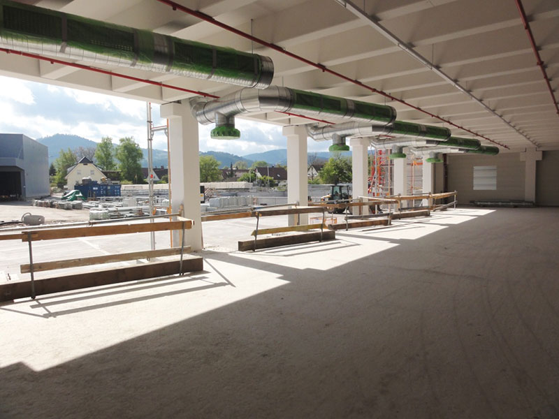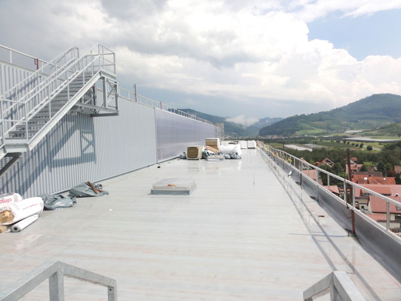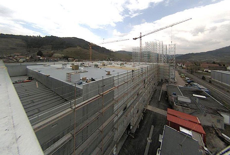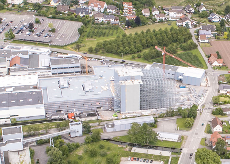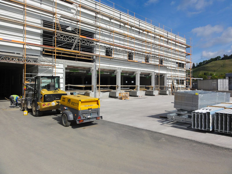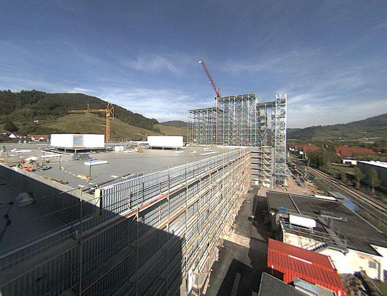 Parallel dazu wurden die Rohbauarbeiten für das Schneidezentrum und den neuen Versand weitgehend abgeschlossen. Aktuell werden die Dach- und Fassadenelemente verlegt und die Werksstraße im EG des Formatgebäudes weiter fortgeführt.
