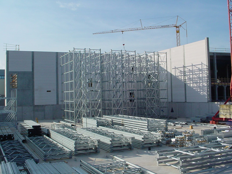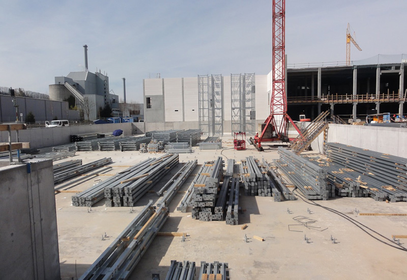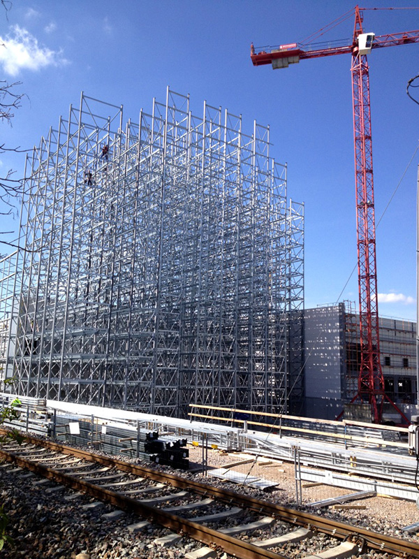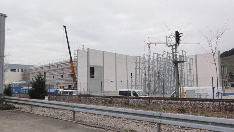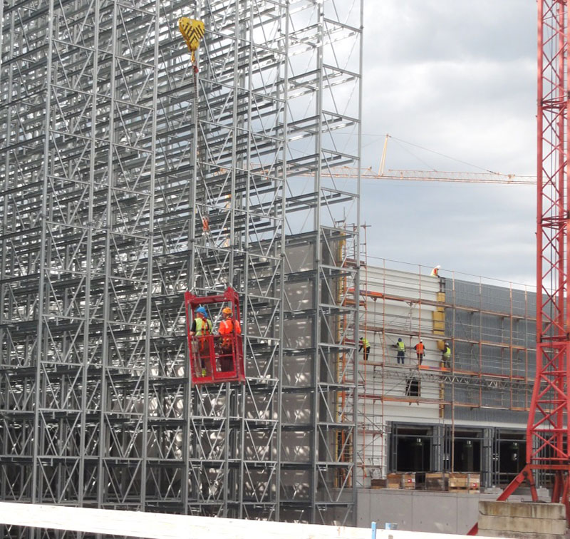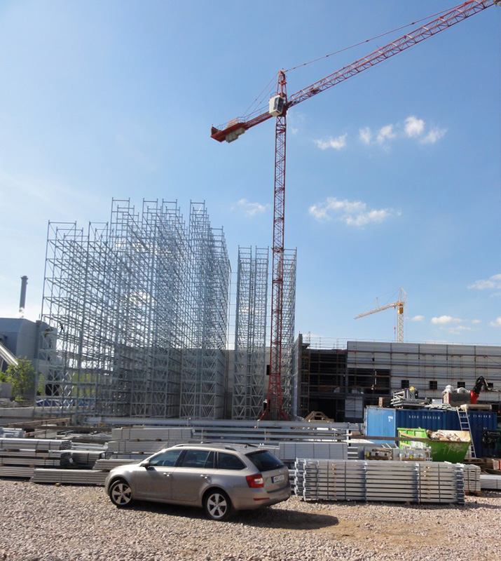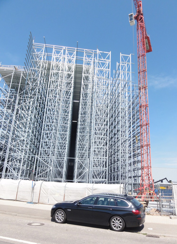 Nach dem Einmessen der diversen Regalgassen beginnt nun der Aufbau der Regale. Noch befinden sich die ersten Regalfelder im Schatten der Brandwand, doch spätestens ab Ende März werden die über 30 m hohen Regale die konventionellen Gebäudeteile deutlich überragen.