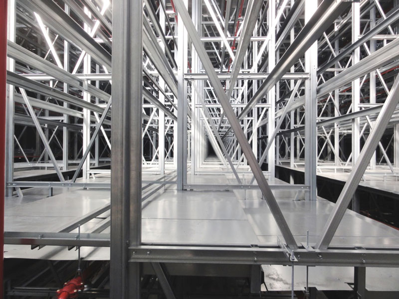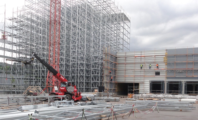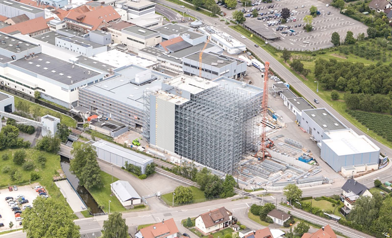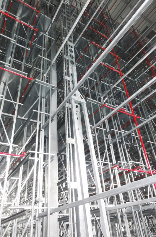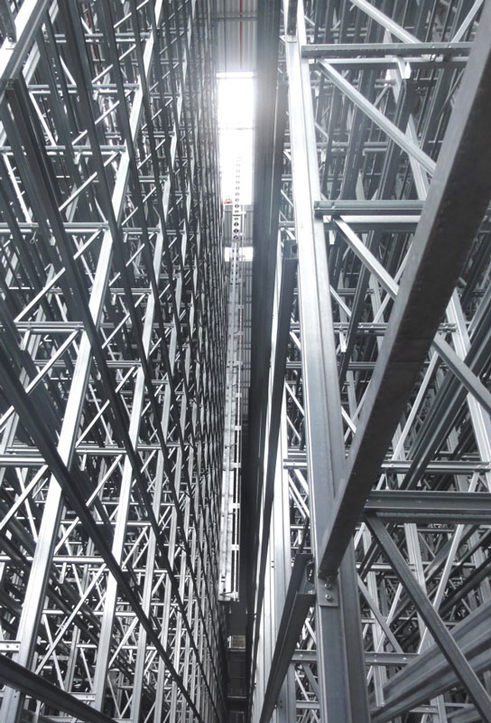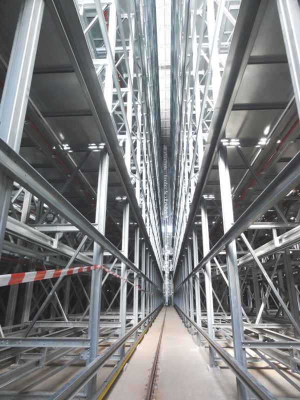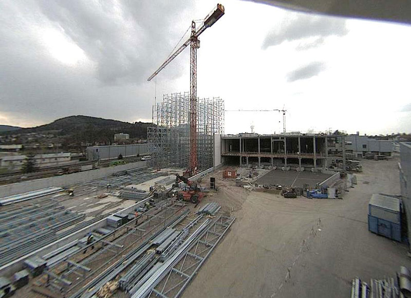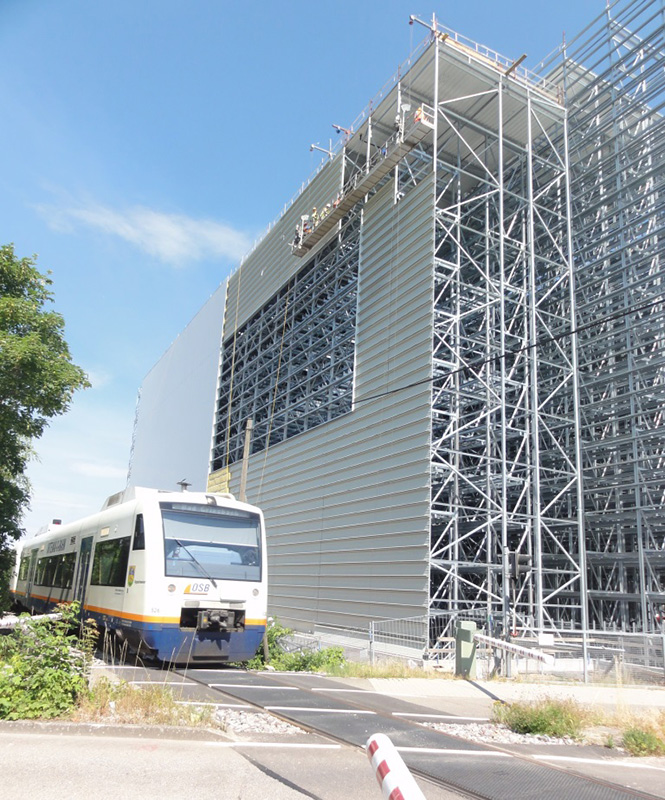 Nach dem Einmessen der diversen Regalgassen beginnt nun der Aufbau der Regale. Noch befinden sich die ersten Regalfelder im Schatten der Brandwand, doch spätestens ab Ende März werden die über 30 m hohen Regale die konventionellen Gebäudeteile deutlich überragen.