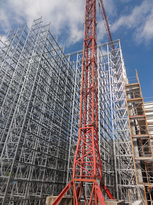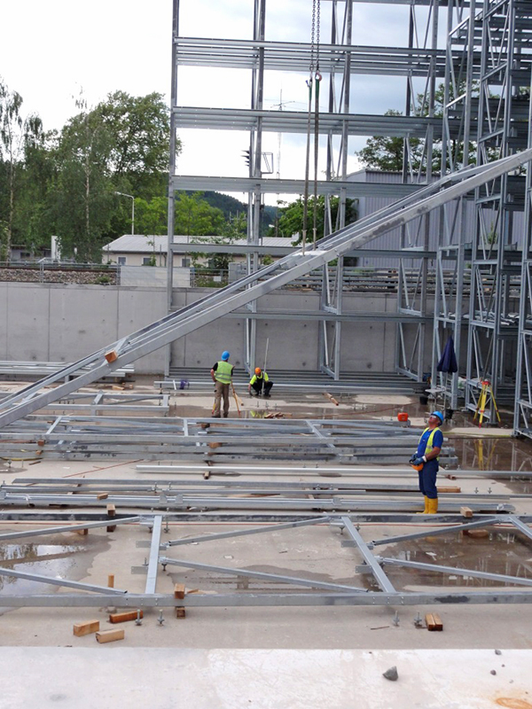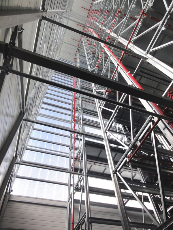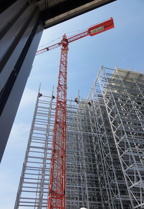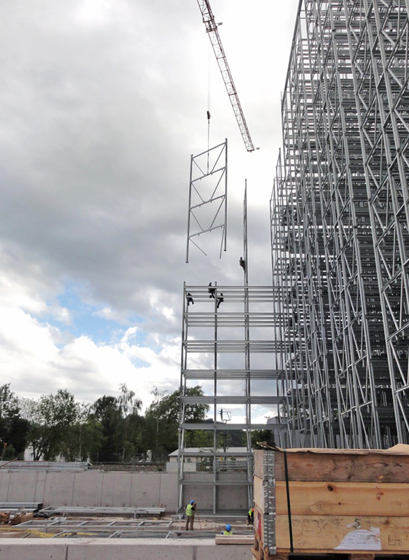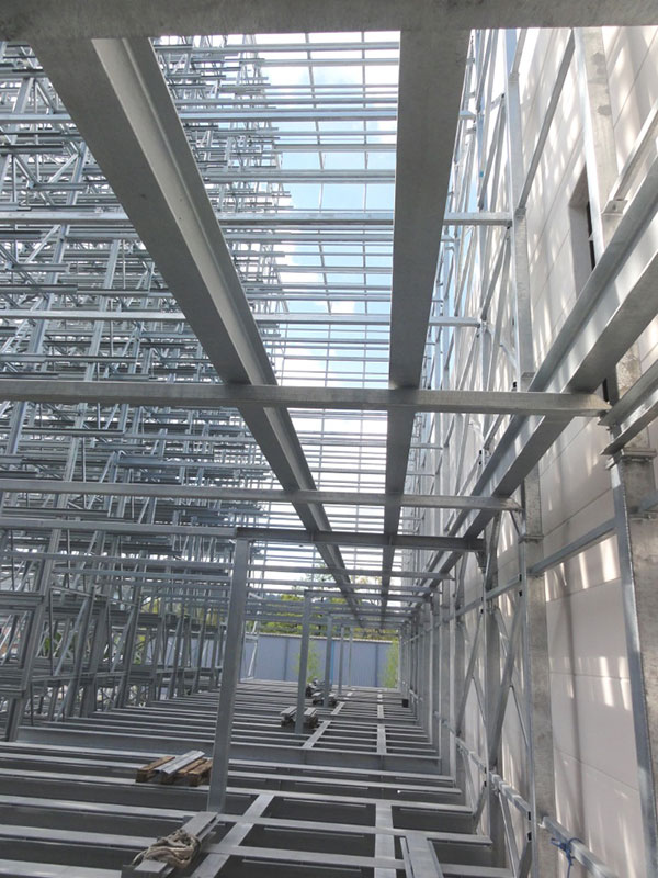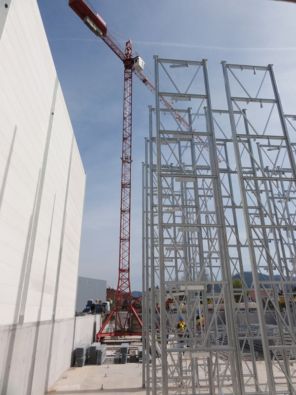 Aufgrund der beengten Platzverhältnisse für die Lagerung der Stahlkomponenten wurde auf Anregung von Luy & Partner zwischen Bauherrn und der mit der Ausführung beauftragten Spezialfirma Voestalpine Krems Finaltechnik eine Regalmontage mittels „Kletterer“ vereinbart. Damit entfällt der sonst notwendige Flächenbedarf zur Vormontage von größeren Regaleinheiten, die dann mittels Kran aufeinander gesetzt werden.