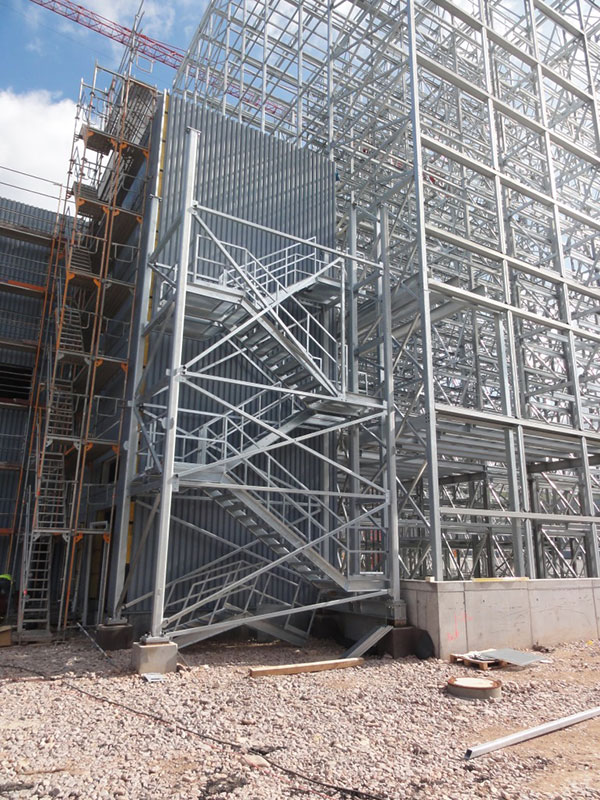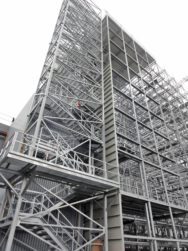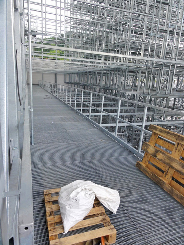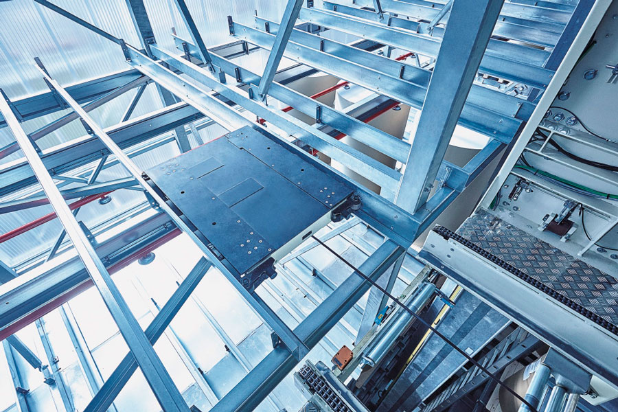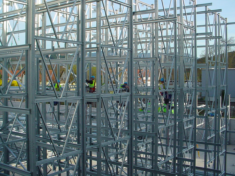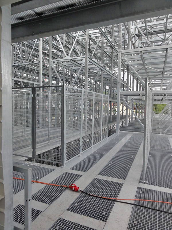 Aufgrund der beengten Platzverhältnisse für die Lagerung der Stahlkomponenten wurde auf Anregung von Luy & Partner zwischen Bauherrn und der mit der Ausführung beauftragten Spezialfirma Voestalpine Krems Finaltechnik eine Regalmontage mittels „Kletterer“ vereinbart. Damit entfällt der sonst notwendige Flächenbedarf zur Vormontage von größeren Regaleinheiten, die dann mittels Kran aufeinander gesetzt werden.