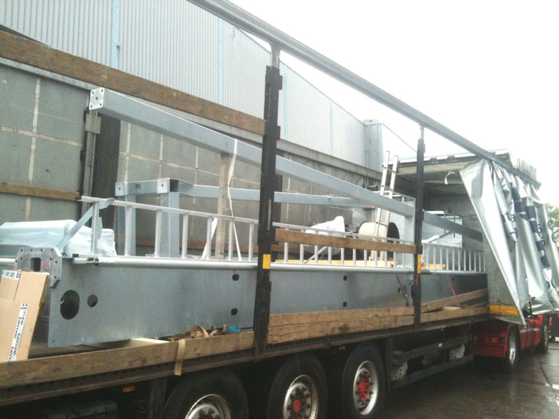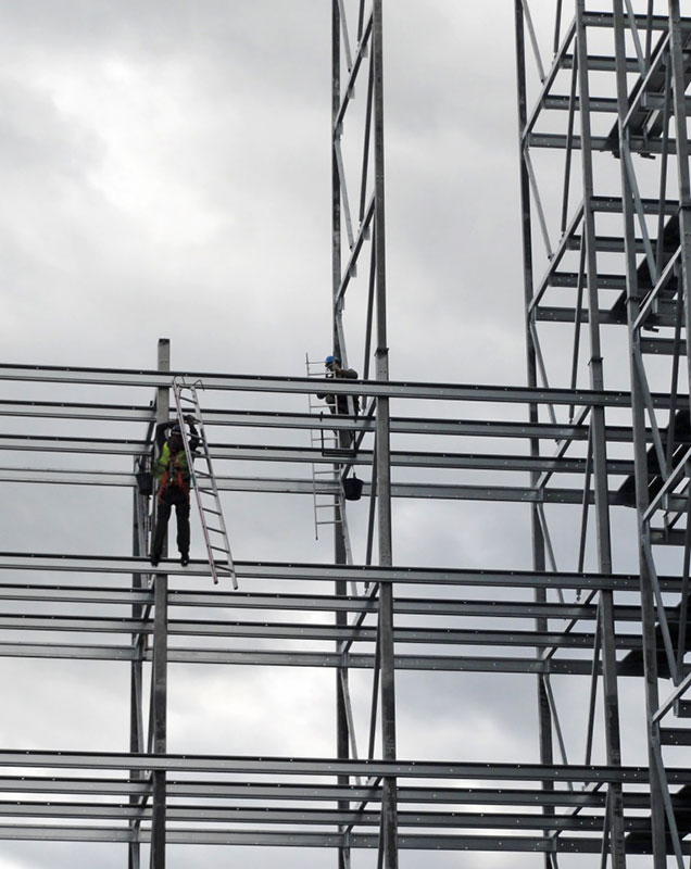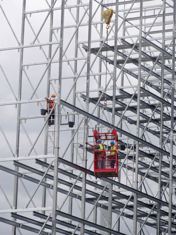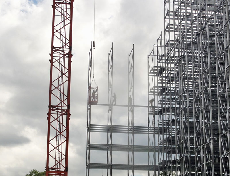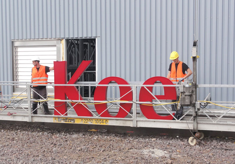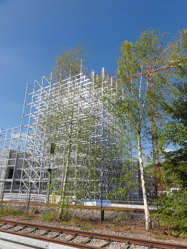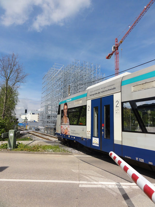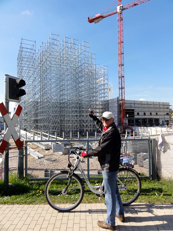 Spätestens in einer Woche wird es auch für die vorbeifahrenden PKW- und Bahninsassen spektakulär, wenn 8 – 12 geübte Kletterer mittels kurzer Stummelleitern in luftiger Höhe die einzelnen Stahlkomponenten zu Regalfeldern und Regalgassen montieren.