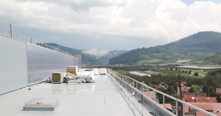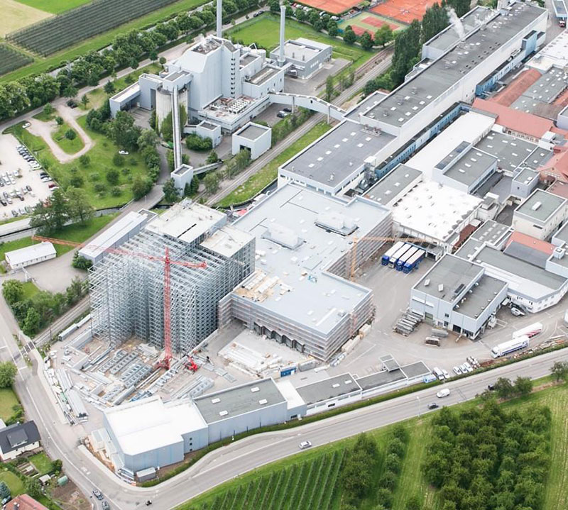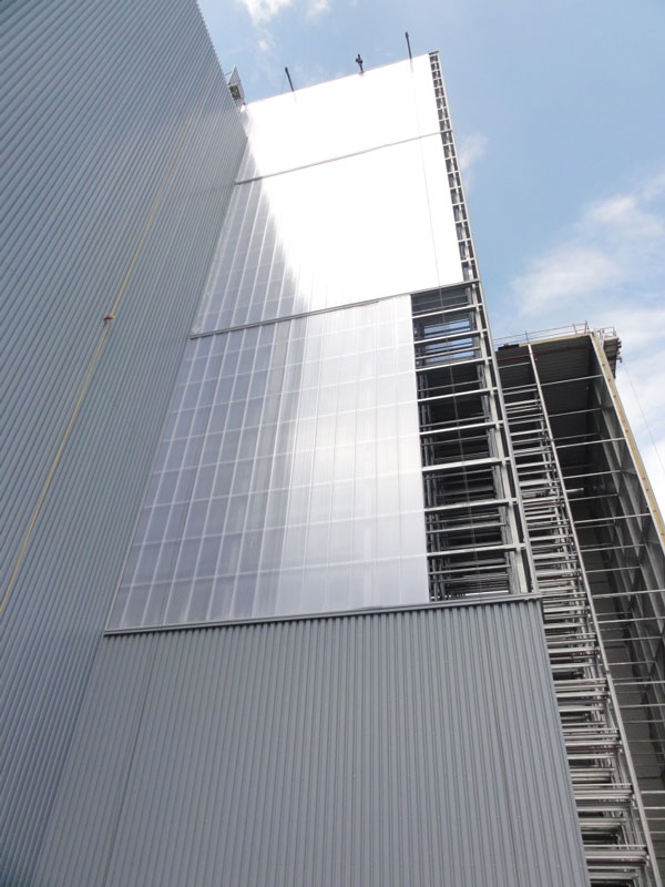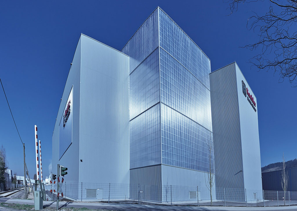 Entsprechend dem Fassadencharakter bei Fripa-Hygienepapier in Miltenberg wurden die Fassaden in Abstimmung mit Koehler und dem Architekten durch großformatige Polycarbonat-Elemente aufgelockert. Neben der positiven Außenwirkung resultiert daraus auch eine angenehm helle Atmosphäre innerhalb des HRL. Dies wirkt sich erfahrungsgemäß sehr positiv im Rahmen späterer HRL-Besichtigungen aus.