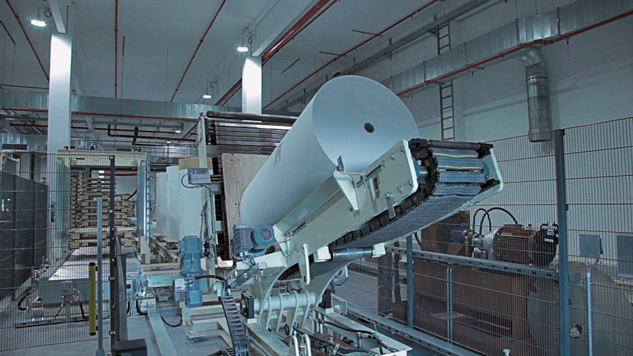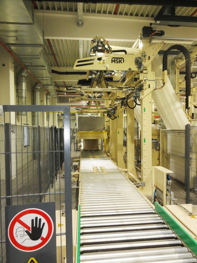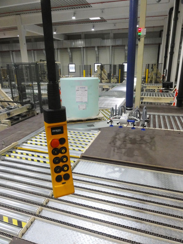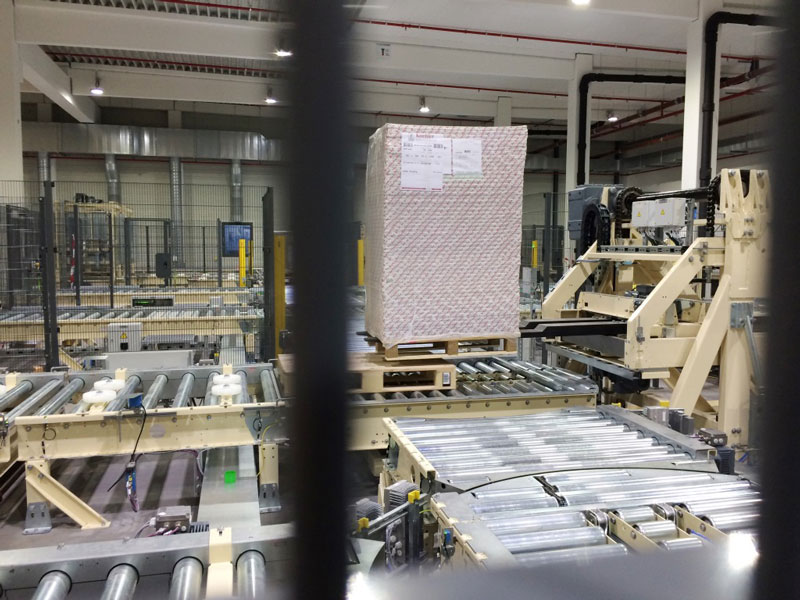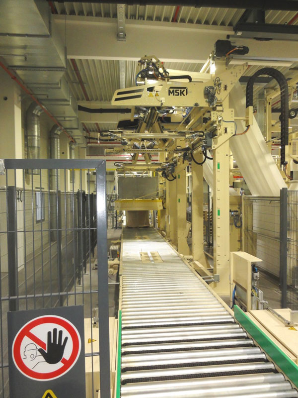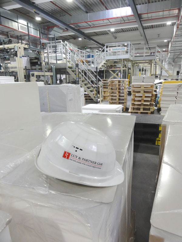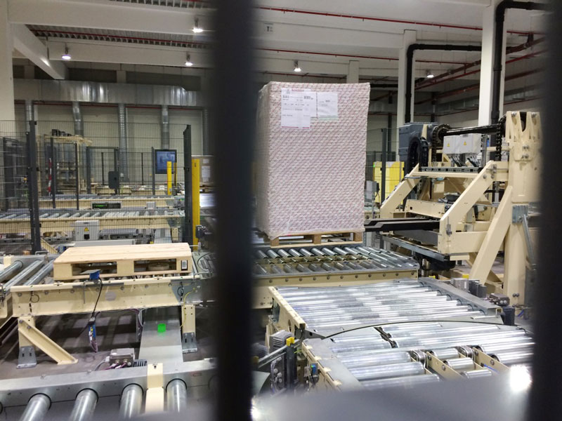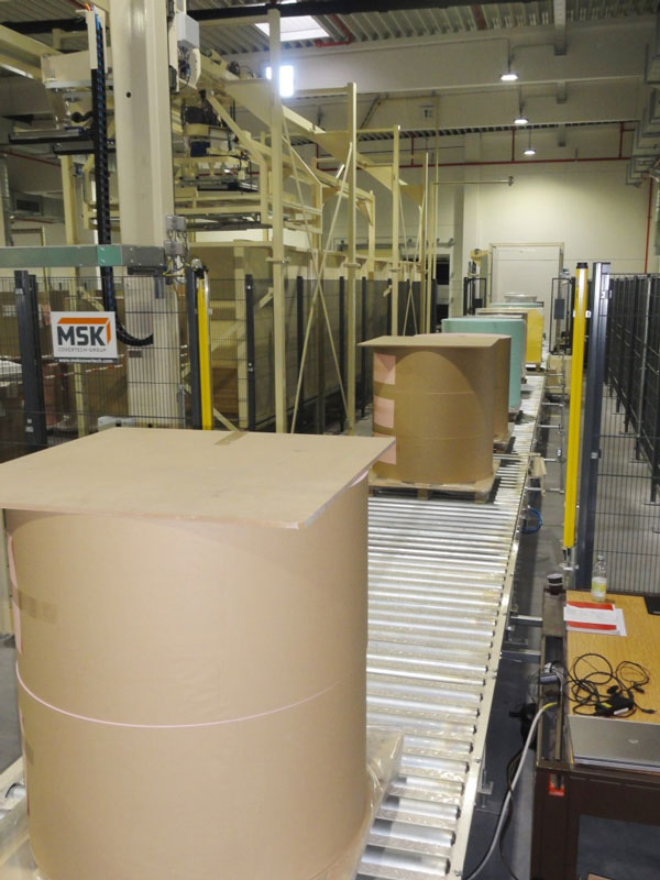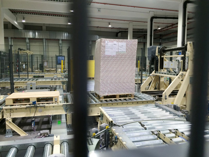 Nach den ausführlich erfolgten IBN-Tests wurde am 03.12.2014 erstmals die Papierproduktion (Rollmaschinen) direkt an die neue Palettenfördertechnik zur Weiterbearbeitung an der Zentralen Packstation (Deckeln, Schrumpfen, Etikettieren) angeschlossen. Vor der Einlagerung ins HRL erfolgt das Aufsetzen der Ladeeinheit (Papierformate / -rollen auf Einwegpalette) auf definierte interne Systempaletten an zwei Palettenuntersetzstationen. Die Trennung zwischen Ladeeinheit und Systempalette erfolgt auf dem Weg zum Versand über zwei Depalettierstationen.