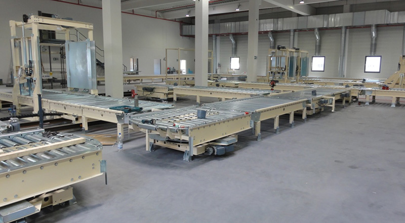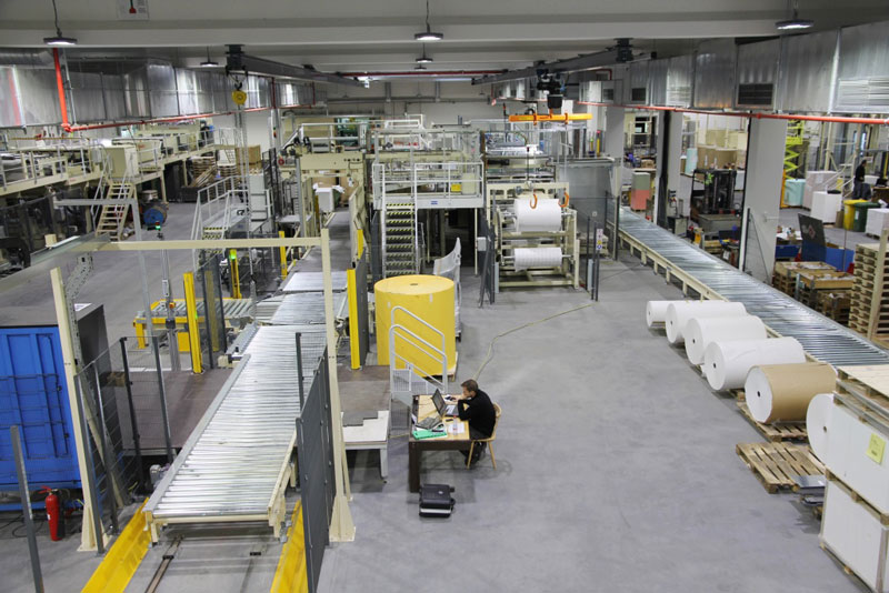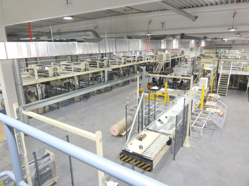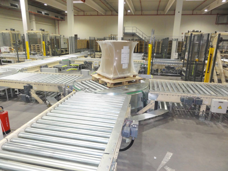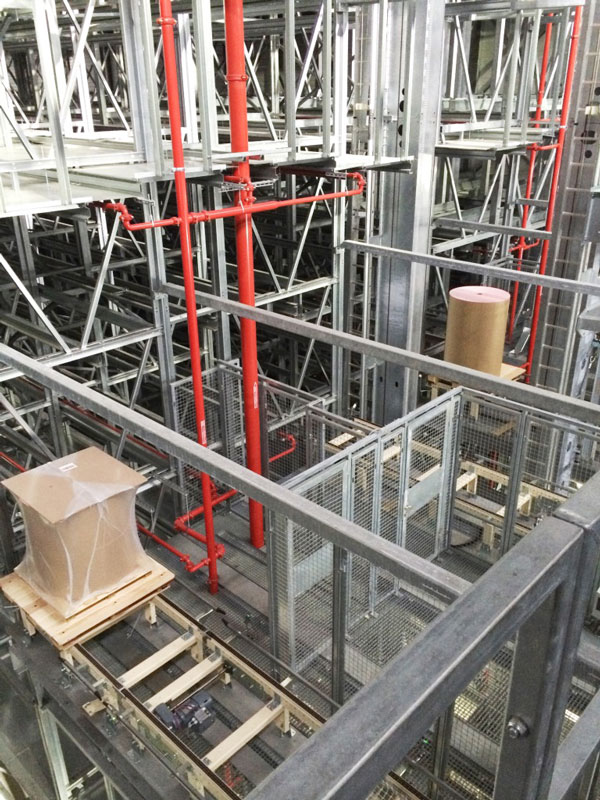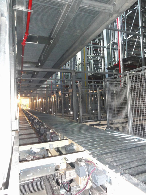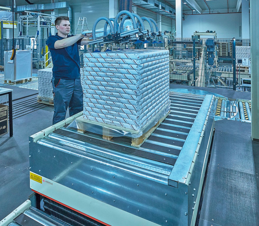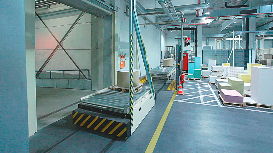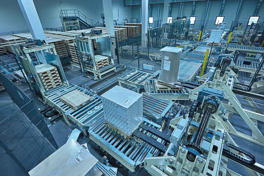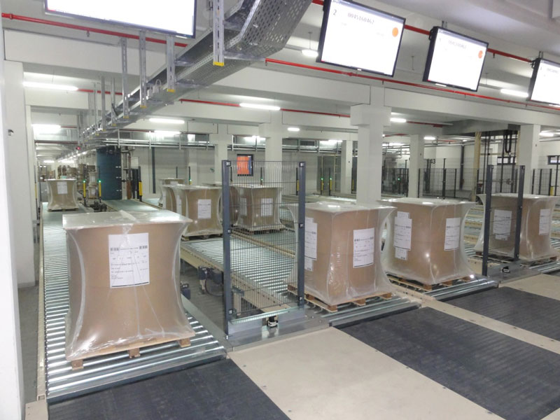 Nach den ausführlich erfolgten IBN-Tests wurde am 03.12.2014 erstmals die Papierproduktion (Rollmaschinen) direkt an die neue Palettenfördertechnik zur Weiterbearbeitung an der Zentralen Packstation (Deckeln, Schrumpfen, Etikettieren) angeschlossen. Vor der Einlagerung ins HRL erfolgt das Aufsetzen der Ladeeinheit (Papierformate / -rollen auf Einwegpalette) auf definierte interne Systempaletten an zwei Palettenuntersetzstationen. Die Trennung zwischen Ladeeinheit und Systempalette erfolgt auf dem Weg zum Versand über zwei Depalettierstationen.