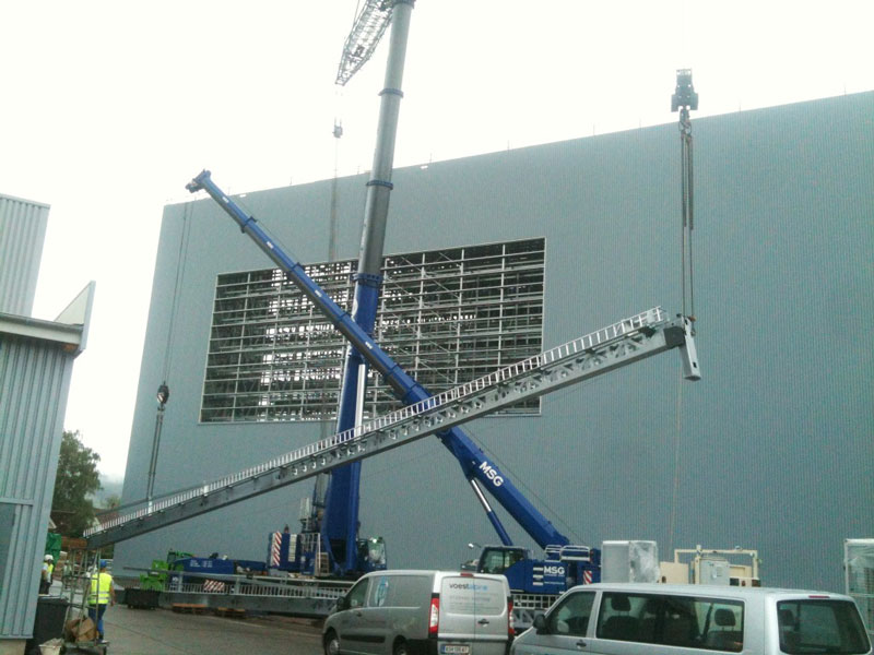 Auch das trübe und überwiegend regnerische Wetter konnte die erfolgreiche Einbringung von fünf 2-Mast-RBG nicht beeinträchtigen. Die beteiligten Teams von Aberle (GU-Logistik), Voestalpine (HRL-Stahlbau), Hammersen (Dach & Wand), LTW Intralogistics (RBG) und MSG (Mobilkran) entfalteten dabei Ihre volle Professionalität.