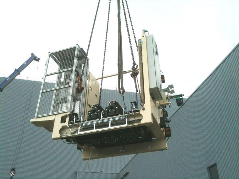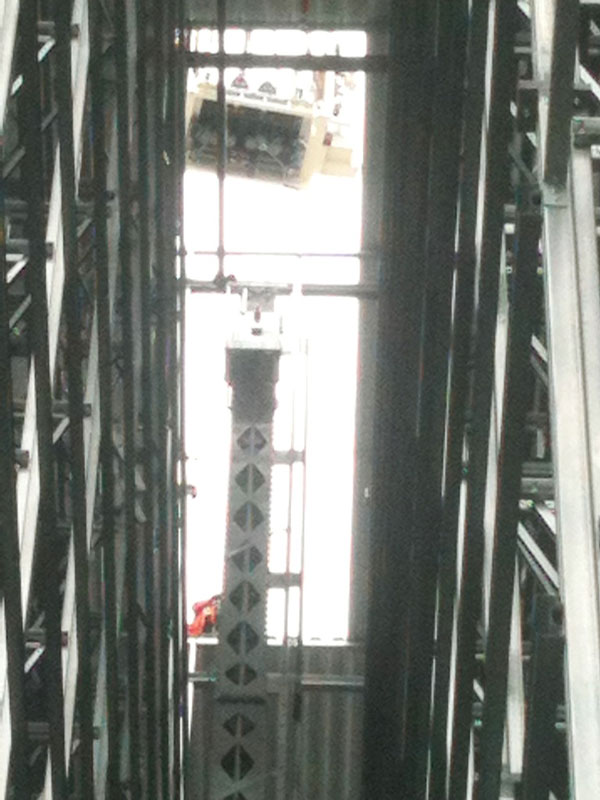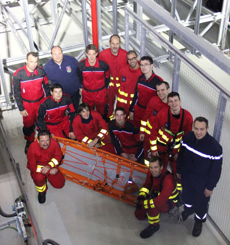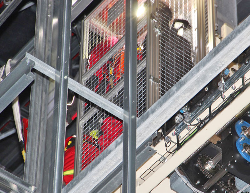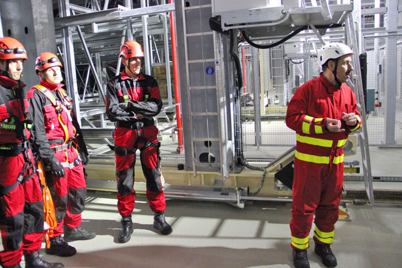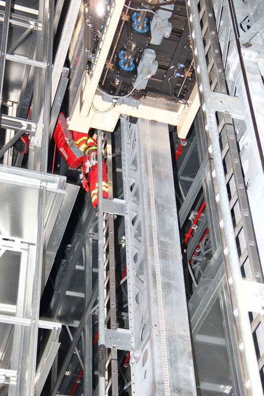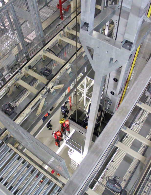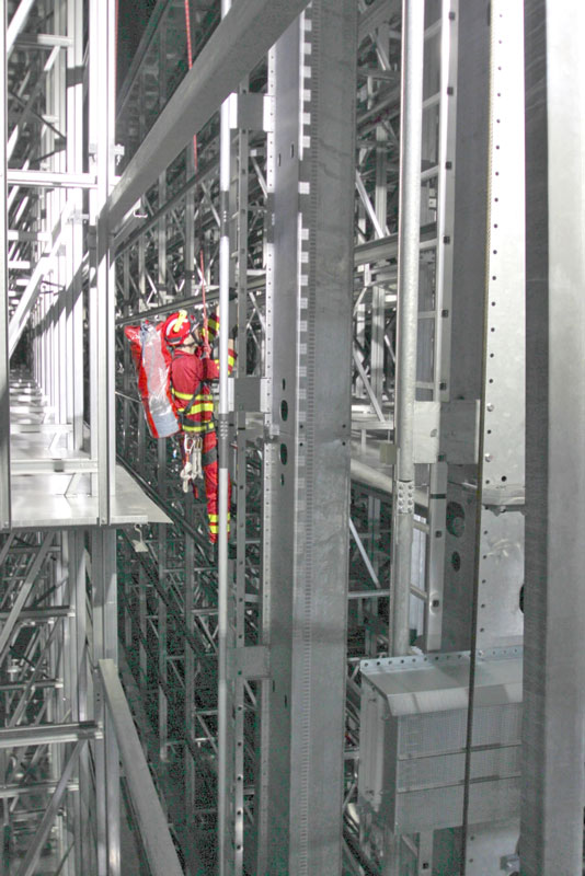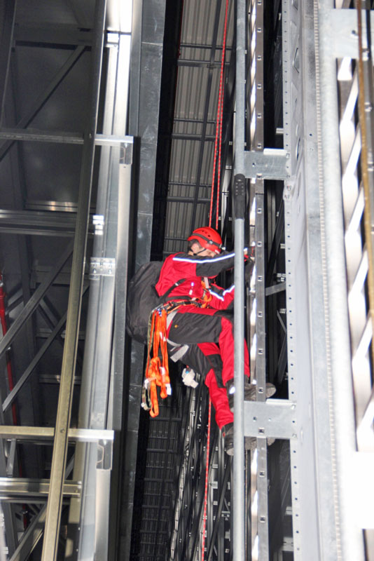 Rettung eines bewusstlosen Monteurs aus der RBG-Mitfahrkabine in einer Höhe von ca. 25 m unter den erschwerten Bedingungen eines Spannungsausfalls, d.h. kein Herablassen der Kabine auf Bodenniveau möglich.