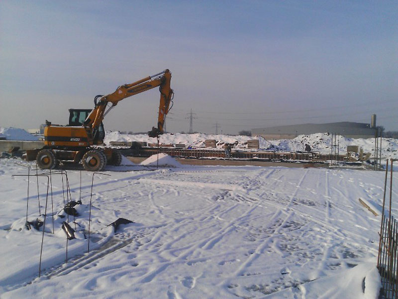 Nach Wiederaufnahme der Bautätigkeit Ende Februar wurden nachstehende Baumaßnahmen (Abschluss HRL- Bodenplatte + Sockel) als Basis für die anstehende HRL- Regalmontage in Angriff genommen.